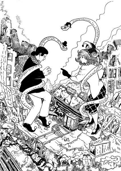 月初,城市的居民都死光了——所有人,除了那两个小丑。这天早晨,他们坐在各自的角落里,脱去可笑的外衣,疲惫地看着对方。然后,他们站起身,拥抱在一起,捧腹大笑。两个人挽着手臂,捡起人行道上的硬币。他们穿过被摧毁的城市,小心地避免踩到尸体,然后离开,去寻找下一座城市。