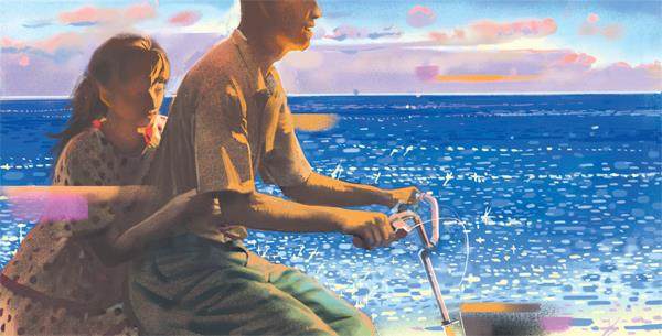 他们摇摇晃晃地沿着海边道路前行。为了帮少女练习骑自行车他们才上了岛,今天算是第三天。连接岛和陆地的桥很窄,有二百米长。岛上没有大车行驶,顶多就是拖拉机和手扶三轮车。之前,他们在这条沿着海湾的海边公路上学骑自行车,少女本来骑得很好,可是一有大车出现,她就会失去平衡。