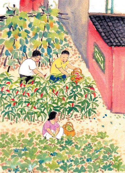 说到吃,我首先想到老妈的菜园,那也是个百花园。茄子花、辣椒花、豆角花、冬瓜花、黄瓜花、南瓜花……自从老妈栽下它们,我就每天去看它们的长势,帮老妈浇水,开花数花朵,结果数果子。花开花谢,瓜果熟了,自己吃不过来,送的送,卖的卖,整个夏天都热热闹闹。大冬瓜个儿比我大,至少要两个人抬;南瓜比我胖,经常用来当坐墩。到了秋天,老妈将冬瓜、南瓜存放在床底下,可以吃上一两个月。