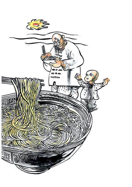真正住到北方之后,却发觉自己变得会吃面了。原来南方人吃面重浇头或汤头,真正面的部分却是差点意思。而北方人吃面,看重的是面本身,一碗简单的清汤和一点点香辛的调料,便能衬托出面之筋道、面之骨气、面之精神。最典型的例子,莫过于兰州的牛肉面,“一清”“二白”“三红”“四绿”都是配角:一碗清可见底的牛肉汤、几片爽脆的白萝卜、几滴鲜红透亮的辣椒油、少许嫩绿清香的香菜和蒜苗。真正的主角,则是手工捣揉、抻摔拉扯出的黄亮润泽的面条。面在滚水中略煮一下就好,加上那“一清”“二白”“三红”“四绿”,这么一碗面端到眼前,饥肠辘辘时,五分钟便能连面带汤吃喝个精光。