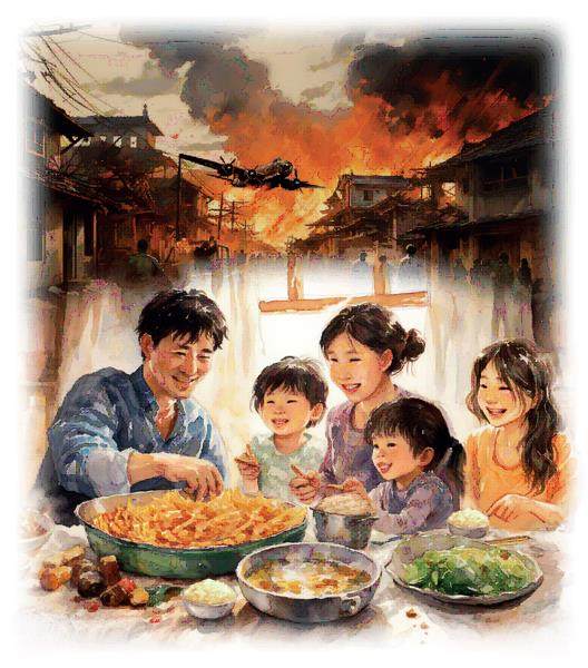 听说接下来的战况会更激烈,于是父亲提议:“照这样下去,我们家肯定难以幸免,不如把剩下所有好吃的东西都吃掉再死吧!”
