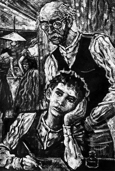 雅科丹先生情绪激昂,文思如泉涌,他觉得自己在这样一个充满创造力的领域中游刃有余。吕西安瞪着眼看了一会儿,不免有点担心。看着看着,他终于伏在桌上睡着了。到了十一点,他父亲把他叫醒,递给他练习本。