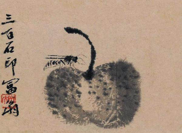 白石有胆,不逾尺纸,浓淡并举,虚实相间,赫然落墨,若天然而就。秋梨形状亦不圆,上下略凹,愈加显出秋梨饱满。秋梨的柄,与秋梨相称,颇带些霸气,仿若“呼啦啦”生出。秋梨并不是新摘下的,而是稍稍放置了,三五天,七八天,皮上的水汽稍褪,而皮色略显厚了、韧了。这“陈”了一点的秋梨,是为了衬出“新鲜”的细腰蜂吗?