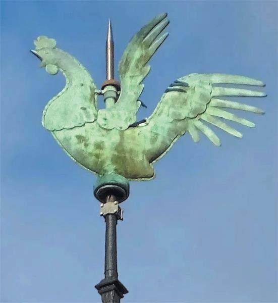 法国最著名的公鸡。在巴黎圣母院的尖顶有一个公鸡风向标,它并非由普通金属制成,而是用一种特殊的合金打造的,据说在阳光下会闪烁出奇异的光芒。可惜这个公鸡风向标在2019年的火灾中从96米的高空坠落,虽受损严重,但依旧可以看到公鸡的面貌,现在放在博物馆进行展览。