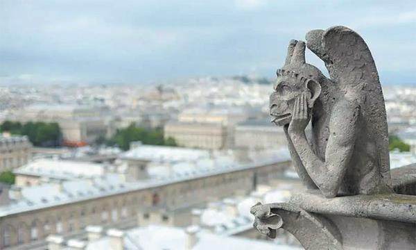 极具艺术美感的排水管道。巴黎圣母院教堂顶部的一些排水管道,被巧妙地设计成了天使翅膀的形状。大家更熟悉的是屋顶的滴水嘴兽,看上去就像伸长脖子的小怪兽,下雨的时候充当排水系统,让雨水顺着脖子倾泻而下。屋顶最著名的排水器是那个名为“思提志”的怪兽,它蹲在教堂顶,双手托腮直视前方,翅膀在背后夹紧,似乎在认真思考。