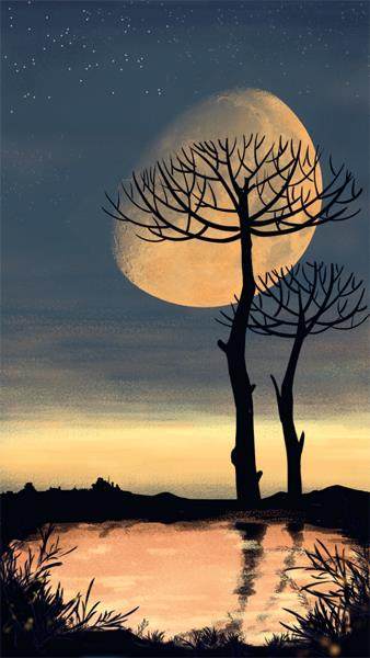 月亮上了中天,油黄黄,像一块圆煎饼。月光却莹白,河水生辉。凤凰山的斜影倒沉下来,虚晃晃。树影投射在河面上,被水卷起皱纹。树影不沉在水底,不浮在水面,也不流走。被树叶树枝剪碎的月光,以白色斑纹的形式修饰树影。这古老的图案,在月夜显现,还原了我们消失的原始记忆。