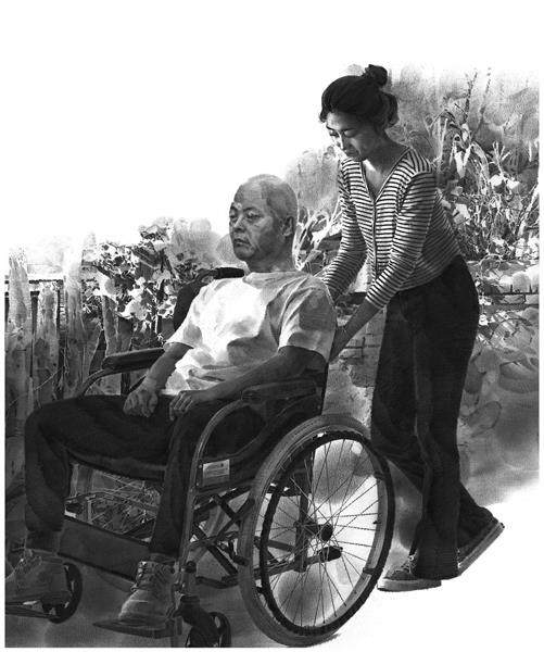给爸爸擦拭身体的时候,我常常忆起小时候爸爸给我洗头的场景——二十几岁之前我一直都是短发,小时候比男孩子还淘气,爸爸会一把将我的头按进水盆里,像给调皮的小动物洗澡一样。我们都觉得这其实是一个游戏。现在,是一个成年的女儿给虚弱的爸爸擦拭赤裸的身体。我能察觉到一开始他的别扭,但他也只能接受这种状态。给他擦干身体,扑上一点爽身粉,“香香的”,我告诉他,然后再亲一下他。