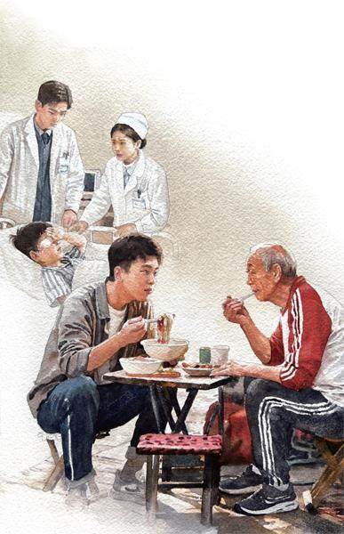 医生去开了票,他替老头额外加了份牛肉。当他站在那支等待取饭的队列里时,那支队列所隐含的绝望的漫长气息令他的眼眶再一次潮湿了。当窗口里的师傅向他响亮地问话时,他才回过神来。