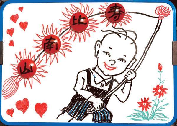 为母亲画画,对我而言,是和母亲谈心,也是对往事的回忆。母亲生日临近时,我想在画上表现祝寿的场面。突然想起了漫画中的三毛。小时候,母亲给我买过一本张乐平画的《三毛流浪记》,三毛的形象是母亲喜欢的。我用黑笔画了一个笑呵呵的三毛,三毛的手里挥舞着一串红灯笼。四个灯笼,就是那四颗红磁石。灯笼上写着“寿比南山”。母亲看着画板上的画,咧嘴一笑,突然轻轻地吐出两个字:“三毛。”