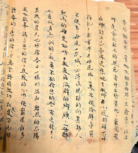 重新联系上的两人像所有热恋期的情侣一样,彼此互诉衷肠。1940年夏天,吴秀琼写道:“您的信,千万言语固然好,就是只字片语,我也欢喜。读了您的信,焦燥(躁)的心田便松凉许多。炎热的夏天也好像春日一样的温和,酷烈的太阳也变成月亮似的。”