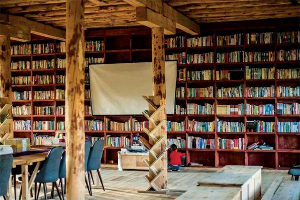 久美新建的房子,如同古朴的民居。门前台阶并未被磨平,由粗糙的石条、石板参差垒成,豁口交错。几步之后,我们进入图书馆,内墙只由土和草构成,没有粉刷涂料,就是原本的浅黄与蜜色,暖融融的。墙一拃厚,泥土混杂着干草,有裂开的纹路。木材没那么规整,像是最初砍伐好的样子。门闩厚实,房梁有粗有细,有隆起;地板带着木材本来的花纹和结节,踩在上面发出吱嘎的轻响。我问久美是跟谁学的,把房子设计得这么舒服。他说他读了好多建筑方面的书,看不懂复杂的理论,但有一句记得特别清楚——“建筑来自自然”。于是,他只用了石头、木头和泥土,没用其他材料。