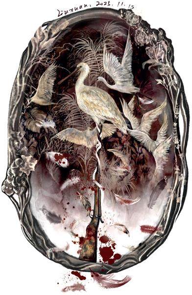 鸟叔跑过去时,看见妻子跪在地上,手电筒掉在一旁,光束斜斜地照在她身上。她的右下腹洇开一片暗红,裤腿上沾着血迹和草屑,不远处的水洼里,几只夜鹭的尸体漂在水面上,翅膀还在微微颤动。