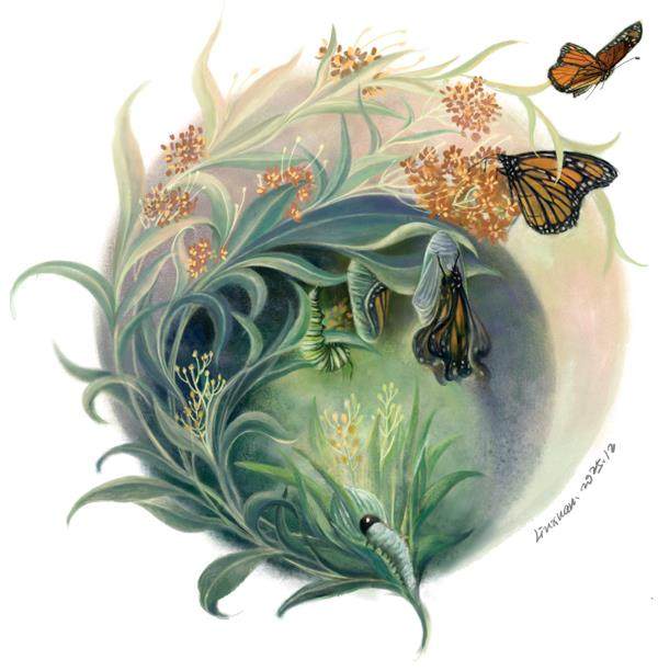 大部分动物根本不敢碰马利筋,有毒成为这种植物最管用的生存法宝。由于这也是蝴蝶的天敌们最害怕的毒药,它的活法是走一条窄路:把毒抢过来。幼虫离开卵壳之后,唯一的食物来源就是这片充满毒素的叶子,它必须学会在有毒的环境中活下去,既不让自己被毒死,还要把毒化为自己的武器。