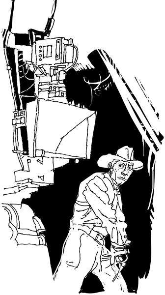 导演约翰·福特坐在一把折叠椅上,身边围着他的助手,对面是安装在轨道上的巨大的摄影机。他拿起喇叭筒喊:“137场,各就各位。鲁迪·鲍曼,这是你的戏了!”