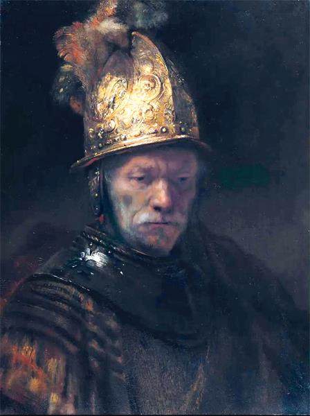《戴金盔的男子》被认为是17世纪荷兰著名画家伦勃朗的代表作之一,如今它被收藏在德国柏林国家博物馆。画中的男子神情威严,头上所戴的金盔采用近乎雕塑般的厚涂技法,让人直观地感受到金属的质地,画中人物被隐入阴影之中,脸部以及背景则使用了薄涂的手法,使色彩衔接中充满了空气感,光芒四射的头盔与阴郁黯淡的面孔形成了强烈的反差,让观者赞不绝口。