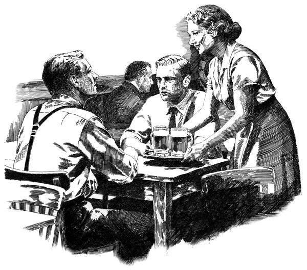 正当他们闲谈时,玛格丽特走进酒吧。当她发现来人时,康拉德偷偷观察她的反应。但她的目光在陌生人身上稍停留一下后,便移到了别处,她毫不吃惊。康拉德回到账柜上,完全放心了。此时,陌生人向大门走去,又高兴地返回柜台,说:“请原谅我,我忘记付账了。”