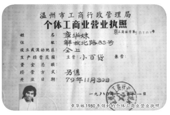 1980年12月11日,章华妹领到了改革开放以后,也是中华人民共和国成立后发出的第一批个体工商业营业执照,她的工商证号为“10101号”。