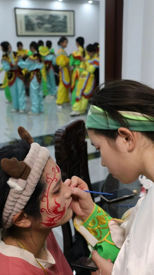 表演时间临近,几声短促的口哨响起,女孩们聚在一起,排成三队,换上了英歌服。衣服是去年订做的,领子上缝着盔甲形状的图案,腰下方绣着虎头,头饰和衣服一样,分为红、黄、绿、蓝四种颜色,头冠上十颗白珠点缀其间。鞋子简单些,白色布鞋上坠着一颗红球,像武术长枪上挂着的红缨。