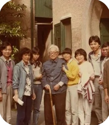 还有一张摄于院子里的合影:巴金执意要送他们出来。伍美琴说:“我们扶着他,他的每一步都显得步履维艰,然而,每一步都是坚定的。在门前的小花园,同学们依依不舍地拍了些照片。看着他拿着手杖站着,像一位生病的爷爷,一种莫名的冲动,使我真想拥抱他一下,像与爷爷一起时似的。”