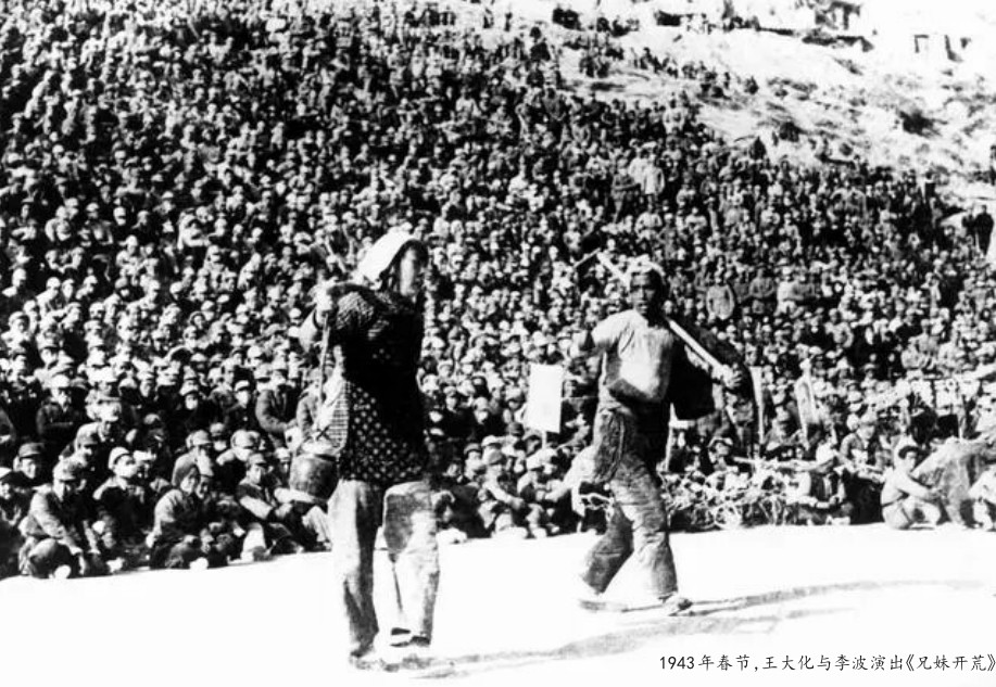 “挑起担儿上呀上山岗,一头是米面馍,一头是热米汤。”在两万多名军民的翘首以盼中,王大化身系红腰带,顶着陕北人民最熟悉的白羊肚手巾跨上舞台,身边是穿着花棉袄的李波。两人唱的是陕北秧歌调,扭的是陕北秧歌舞,演的是陕甘宁边区农民马丕恩父女“早起晚眠,努力生产”的劳模事迹。虽然缺乏专业场地,也没有高端音响助阵,但在观者潮水般的叫好声中,以劳苦大众为主角的《兄妹开荒》,火了!