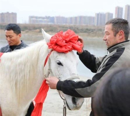 更确切来说,是2025年2月4日下午2点左右,这匹名叫“白龙”的白马,驮着主人依立拜,从湖北仙桃汉江边的堤岸俯冲下来,像一簇银焰,直向水里的人影奔去。江水冰冷湍急,水位没到白龙的下颌。四蹄无法着地,它只能喘着粗气、抻长脖子游动。