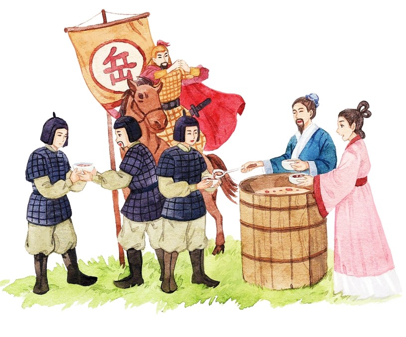 靖康元年(1126年),从平定军突围回到家乡的岳飞目睹了金人入侵后人民惨遭杀戮、奴役的情形,心中愤慨,意欲再度投军抗金,又担忧老母年迈,妻儿力弱,在兵乱中难保安全。母亲深明大义,不仅没有阻拦儿子,还在儿子背上刺下“尽忠报国”四字,激励儿子竭尽全力报效国家,勿忧家事。