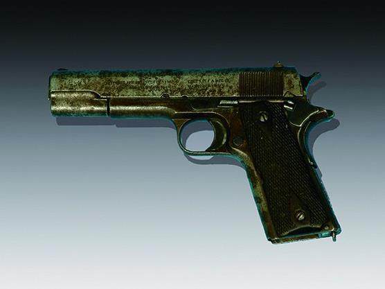 此枪为国家一级文物,是一把美国造柯尔特式自动手枪,长20.5 厘米,重1.2 千克,枪号80292 。
