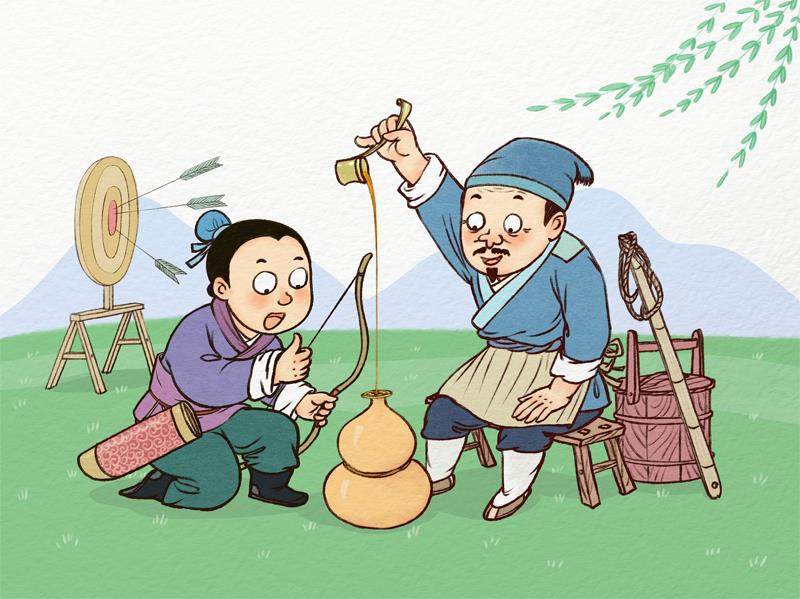 北宋康肃公陈尧咨善于射箭,他在自家院子里练习射箭时,一个卖油的老翁放下担子,站在那里注视着他,看着他的箭术十中八九,只是微微领首。