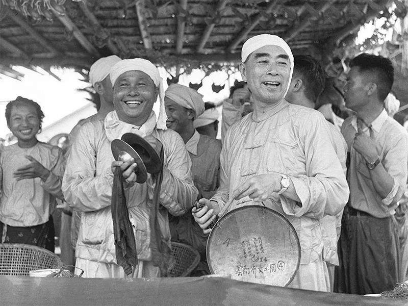 4月15日,是傣历新年最重要的一天,因为这天要举行最盛大的祝福活动——泼水。一大早,欢快的群众就拿着泼水用具向市中心广场和主要街道会集。广场四周和街道两旁,摆着许多高大的水桶,桶里盛满澜沧江水。身着傣族服装的周恩来陪同吴努来到市中心广场,参加这一盛大活动。周恩来捧着银碗,拿着柏枝蘸水,向缅甸贵宾和群众洒去。刚开始时,泼水活动还相对“文明”。慢慢地,群众都用茶缸和脸盆互相泼水,周恩来也换了一个大脸盆泼水。在欢笑声中,吴努背起象脚鼓,双手交叠击打起来。周恩来也和群众一起踩着鼓点,跳起了傣族舞蹈。