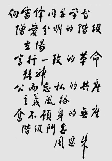 于是,周恩来第二次为雷锋题了词:向雷锋同志学习,憎爱分明的阶级立场,言行一致的革命精神,公而忘私的共产主义风格,奋不顾身的无产阶级斗志。