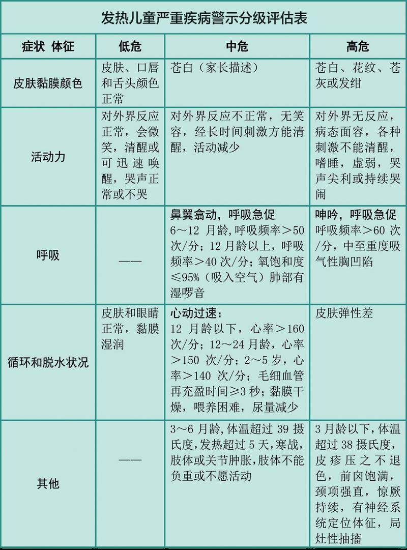 家长可以根据下表,判断孩子的病情严重程度。孩子的情况为低危,可居家观察;为中危,尽快就医;为高危,立刻前往医院就诊。