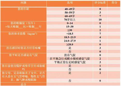 医生给了李大爷一份筛查问卷(慢阻肺筛查问卷见下页图表)。当总分≥ 16 分时,患者就需要进一步完善肺功能检查。后来,在医生和家人的监督下,李大爷接受了肺功能检查。检查结果是,限制性通气功能障碍。通过胸部CT,李大爷被确诊为慢阻肺。