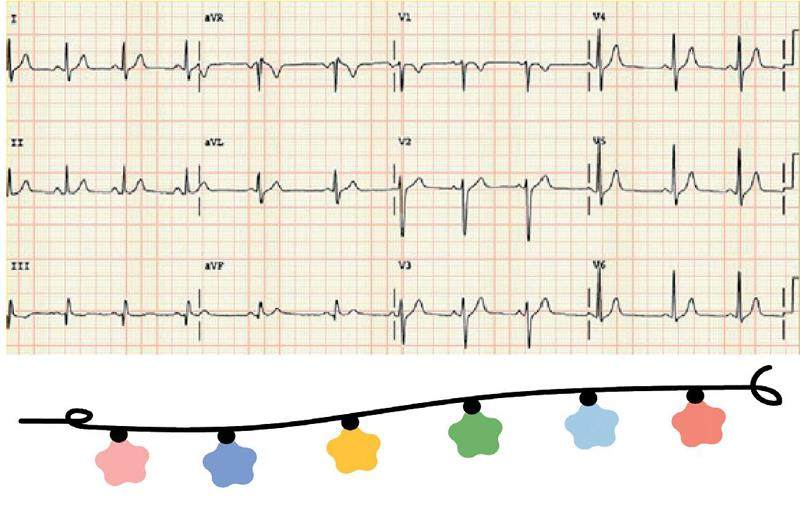 门诊中,常有患者问:“大夫,我的心电图检查显示为窦性心律,没问题吧?”恭喜您!这就是心脏的正常节律。如右图所示,心电图显示为窦性心律。正常人的心脏有四个腔,包括左心房、左心室、右心房、右心室。在右心房的外上方,有整个心脏的“司令部”——窦房结。窦房结可自动发出节律整齐的指令,频率为60~100次/分。指令依次通过心房、房室结传至心室,使整个心脏按顺序规律、协调地收缩和舒张,从而保证心脏的泵血功能。这种正常的心脏节律被称为窦性心律。