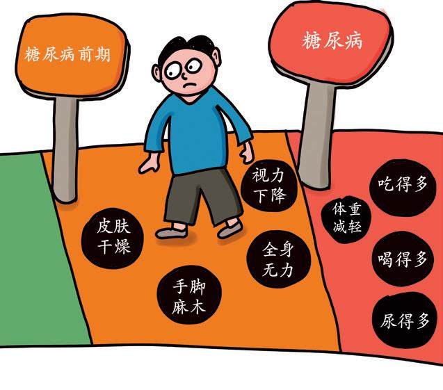 分析与建议:糖尿病患者的典型症状是“三多一少”,即吃得多、喝得多、尿得多、不明原因体重减少。很多糖尿病前期患者没有这些典型症状,但可能存在不典型症状,如皮肤干燥、瘙痒、视力下降、手脚麻木、全身无力等,容易被忽视。