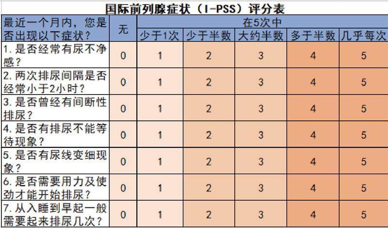 将右侧表格中7个问题的得分相加,总分即是I-PSS评分。评分为1~7分,为轻度;8~19分,为中度;20~35分,为重度。