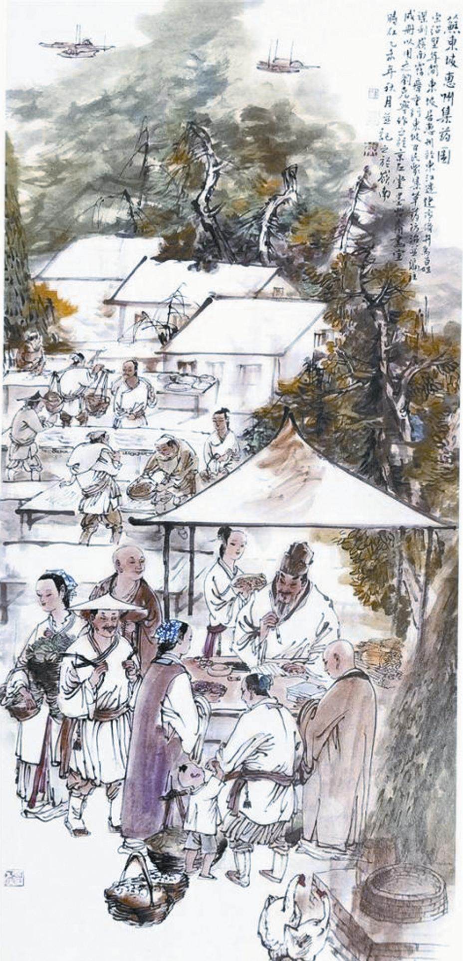 如何看待生死,思索生命的存在价值,是无数世纪以来人们共同的追问,从某种意义上说,苏东坡为我们提供了参考。ZJbAgASRQXwhEpB4OP/aSA==在《千古风流苏东坡》中,苏东坡在将要逝去之际,叫儿子拿来笔墨,写下“心似已灰之木,身如不系之舟。问汝平生功业,黄州惠州儋州”。这是苏东坡对自己一生的总结,他没有将自己担任礼部尚书或知府的经历作为自己一生的荣光,而是将一生功业定格在被贬谪的三地。尽管一生起伏,四处漂泊,多次遭贬,但他仍旷达以待,于是我们便不难理解,即使身处逆境,被贬惠州,苏东坡仍能乐观地写出“日啖荔枝三百颗,不辞长作岭南人”。《苏东坡》的结尾,面对浩浩汤汤的大海,苏东坡的独白响起:“吾善养吾浩然之气,不依形而立,不恃力而行,不待生而存,不随死而亡矣。故在天为星辰,在地为河岳,幽则为鬼神,而明则复为人。”浩然之气,不会因为活着就存在,死亡而消失。此外,剧作还呈现了苏东坡在面对大旱、洪涝等自然灾害时的积极举措。面对干旱引发的粮食短缺,苏东坡将家中的存粮分发给灾民充饥,自己却以清汤寡水为食。此外,在面对洪涝灾害时,民众举家出逃,苏东坡高喊:“请百姓们放心,我与大家同在。我们一家仍在城中,未曾逃离,请大家相信我,我们一起守住城池,守卫家园。”这时的苏东坡,过家而不入,布衣草履,与民众一同抗洪抢险。同样,苏东坡在治理瘟疫时的种种举措也表现了他的智慧和担当,为防止瘟疫蔓延,他首先限制百姓出行,其次要求各大药店降价售药,甚至自己开办了一个官办大药房,药价极低,近乎免费,最后,待疫情得以控制,苏东坡又开始追根溯源,寻找疫情发生的根源。在《东坡家事》中,蚕村的疫情扩散,皇帝接受提议,除找染病者试药,竟然下令火烧蚕村。为了防止事态进一步恶化,苏东坡连夜试药,终于配出解药,接着快马加鞭前往疫区,烧村危机才得以解除。