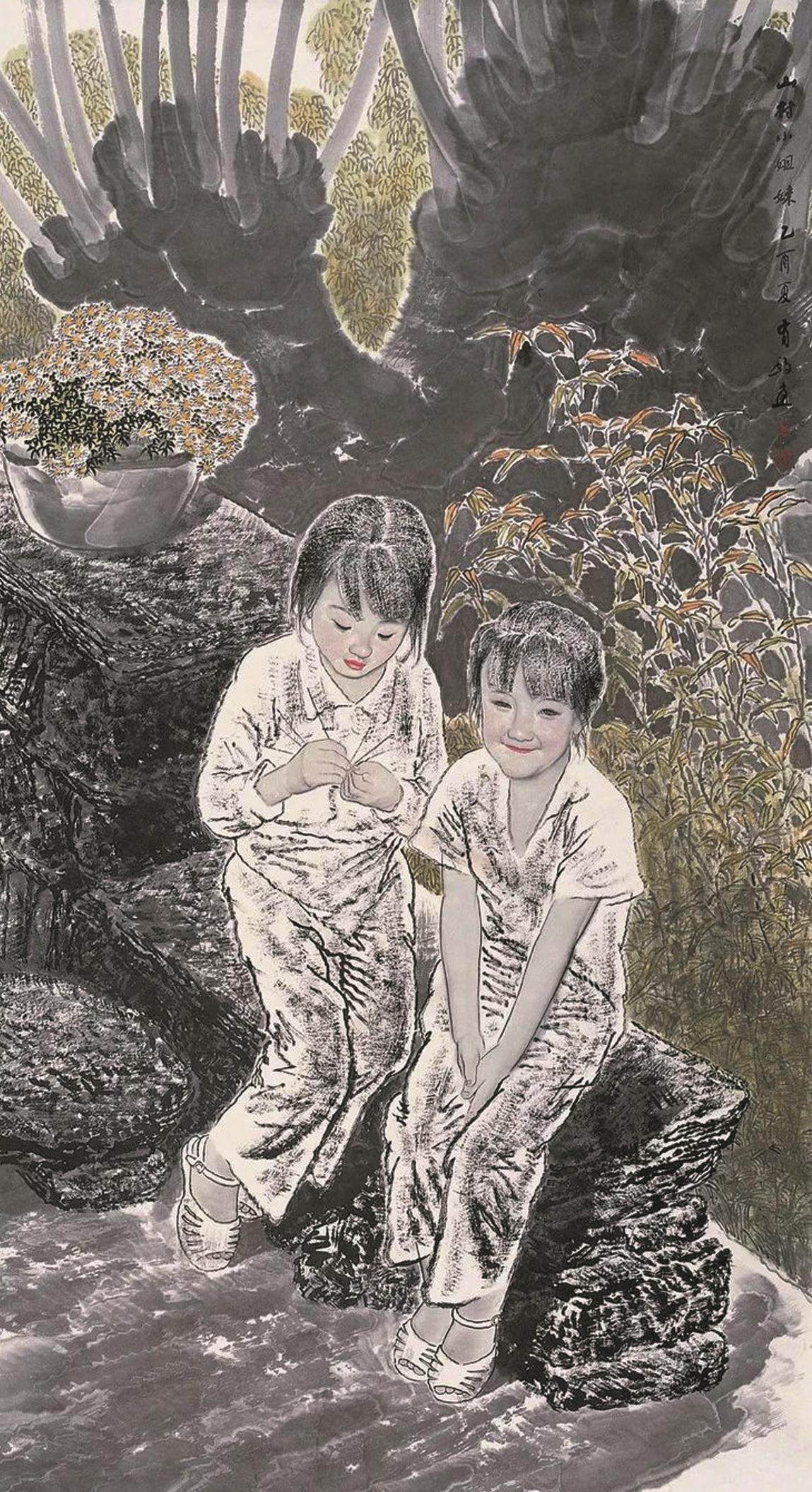 王有政国画《山村小姐妹》。王有政在他的《我的乡间小路》中说:“我偏爱农村,这与我生在农村、长在农村、热爱农村、熟悉农村是分不开的。我确信童年时代在心中播下的爱与美的种子,对艺术家的一生都起着深刻的影响。”