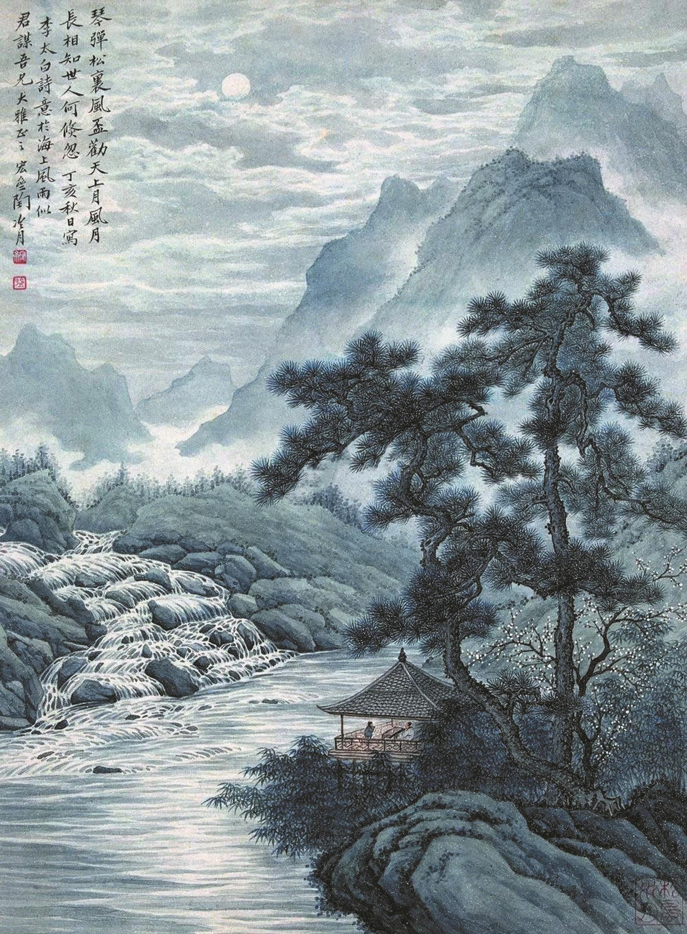 在《酬张少府》一诗中,王维又说:“晚年唯好静,万事不关心。自顾无长策,空知返旧林。松风吹解带,山月照弹琴。君问穷通理,渔歌入浦深。”晚年多疾病,中路有风尘。他说,到晚年特别喜好安静,对人间万事都漠不关心。自思没有高策可以报国,只要求归隐家乡的山林。山林中的生活,摆脱了“案牍之劳行”,身心也就彻底放松了。宽解衣带对着松风乘凉,山月高照正好弄弦弹琴。君若问穷困通达的道理,请听水浦深处渔歌声音。“自顾无长策,空知返旧林”两句,其含义是非常深的。他说,自己没有回天之力,又不愿同流合污,只能洁身隐遁。他又故意用轻松的笔调描写隐居之乐,并对友人说“君问穷通理,渔歌入浦深”,大有深意啊,似乎只有在山林生活中他才领悟了人生的真谛。无需过多修饰,仅留一份明净不俗。