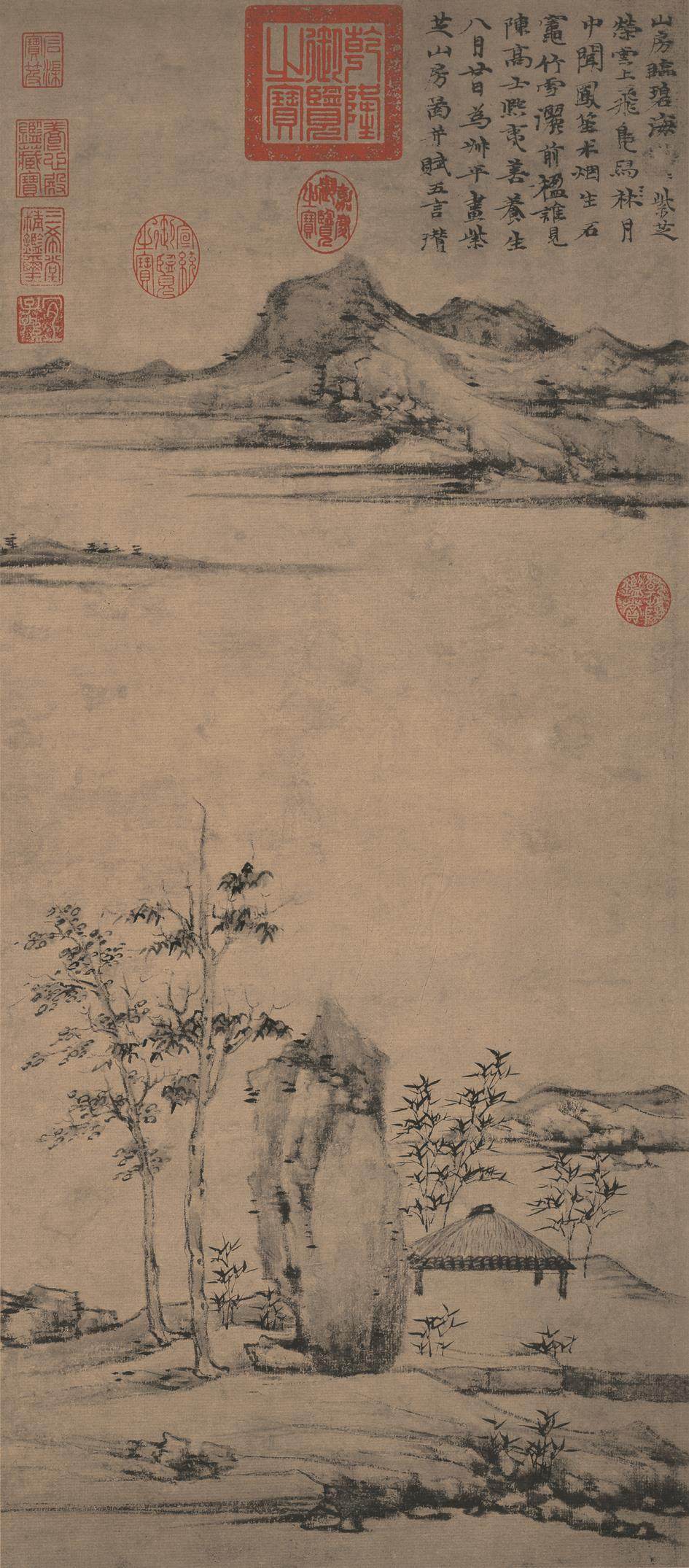 《紫芝山房图》给人以湖光万顷、空明澄净之感。近景绘杂树、坡石、竹林、茅亭,坡石以淡墨干笔皴擦而成,再用焦墨点苔,坡石左侧两棵枯树分左右站立,更增加了画面的空灵之气。右边茅亭用干笔枯墨写之,墨色较枯石稍加浓重。茅亭前后各有数株嫩竹,高矮错落,用笔洒脱写意。中景一片湖光,连接对岸,远景山丘绵延,云气若隐若现。远山用长线枯墨描出,再以干笔淡墨予以皴擦点染,使观者具有开阔疏朗之感。