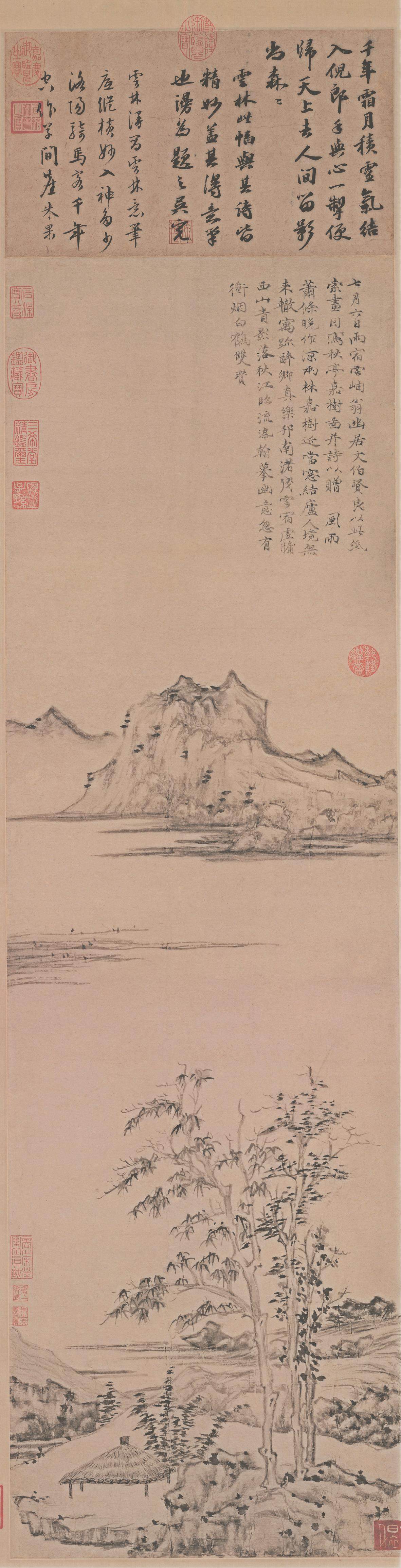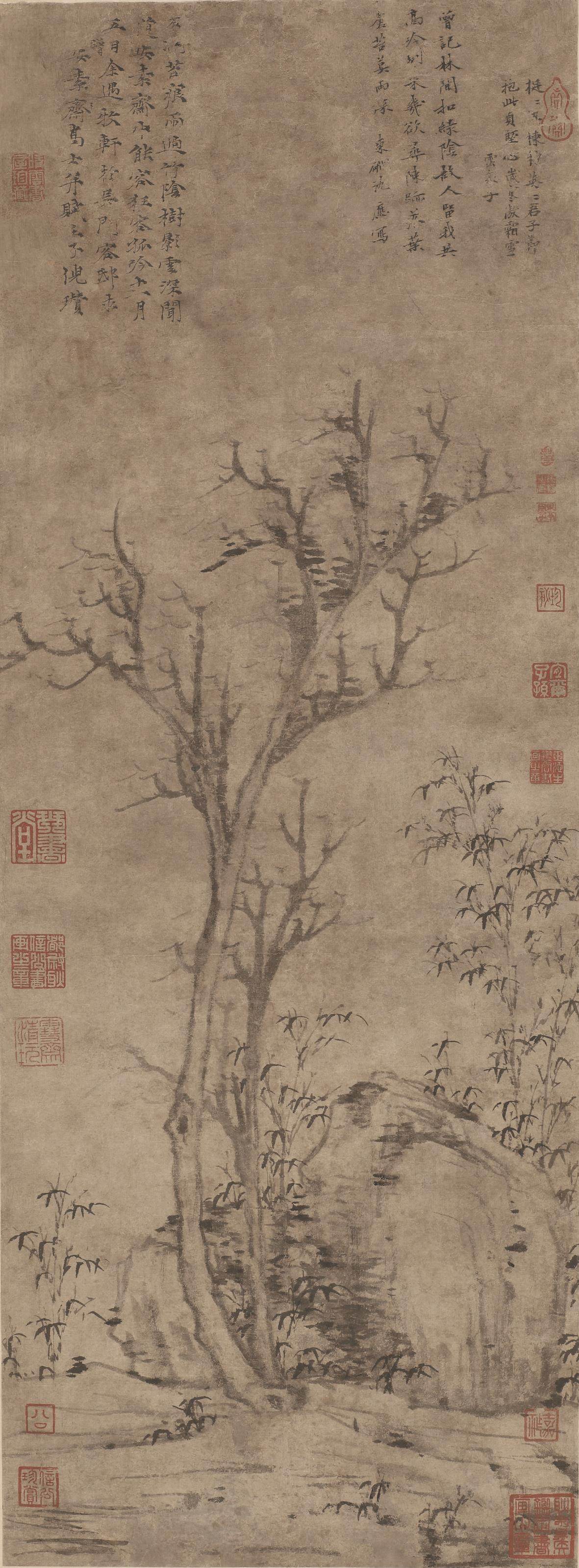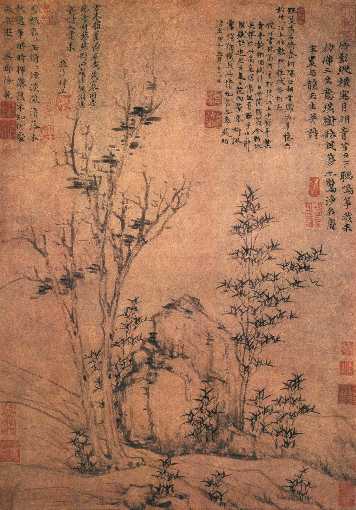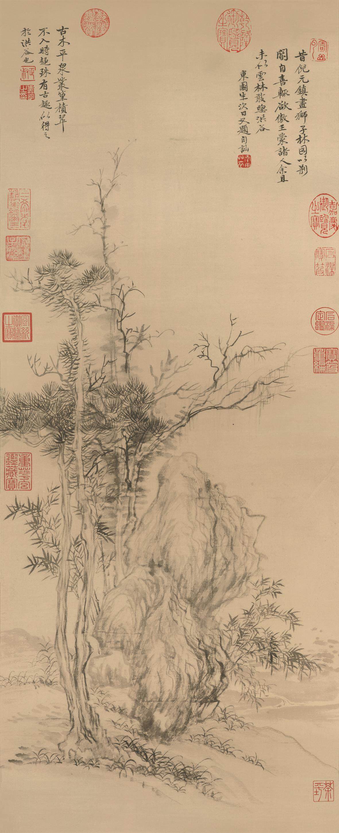 《苔痕树影图》是倪瓒去世前二年绘就的画作,画家时年72岁。该画简洁至极,仅仅描绘两株枯树、一块巨石和数丛细竹。左边枯树较为高大,右边枯树相对低矮。伟岸挺拔的枯树暗喻坚贞高洁之君子品德;画家以侧锋渴笔折带皴刻画巨石,展示山石坚凝的质感。画上竹枝颇细,似断还连,竹叶虽然稀疏,但清气撼人。全画用笔草草,墨色淡雅,意境疏寂,表现了画家独有的胸中逸气。画面左上侧写有倪瓒自题六言诗一首:“石润苔痕雨过,竹阴树影云深。闻道安素斋中,能容狂客孤吟。”末识“十一月五日余遇牧轩于吴门客邸,求赠安素斋高士并赋,壬子倪瓒。”该画右上侧另有二题,其一为沈应题七绝诗一首,其二为云泉子题五绝诗一首。从以上两题来看,除以画来赞美倪瓒的人格外,也表达了对倪瓒生平的回忆,所以这二题应该是倪瓒去世后沈应和云泉子所为。图中钤(钤印即盖印)有清初耿昭忠、耿嘉祚等鉴藏印,明代汪砢玉《珊瑚纲》等书著录,著录中名此作为“安素斋图”。