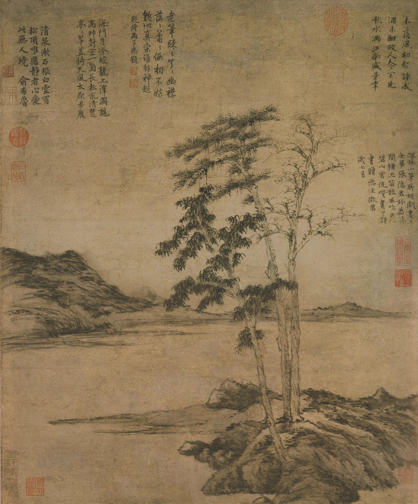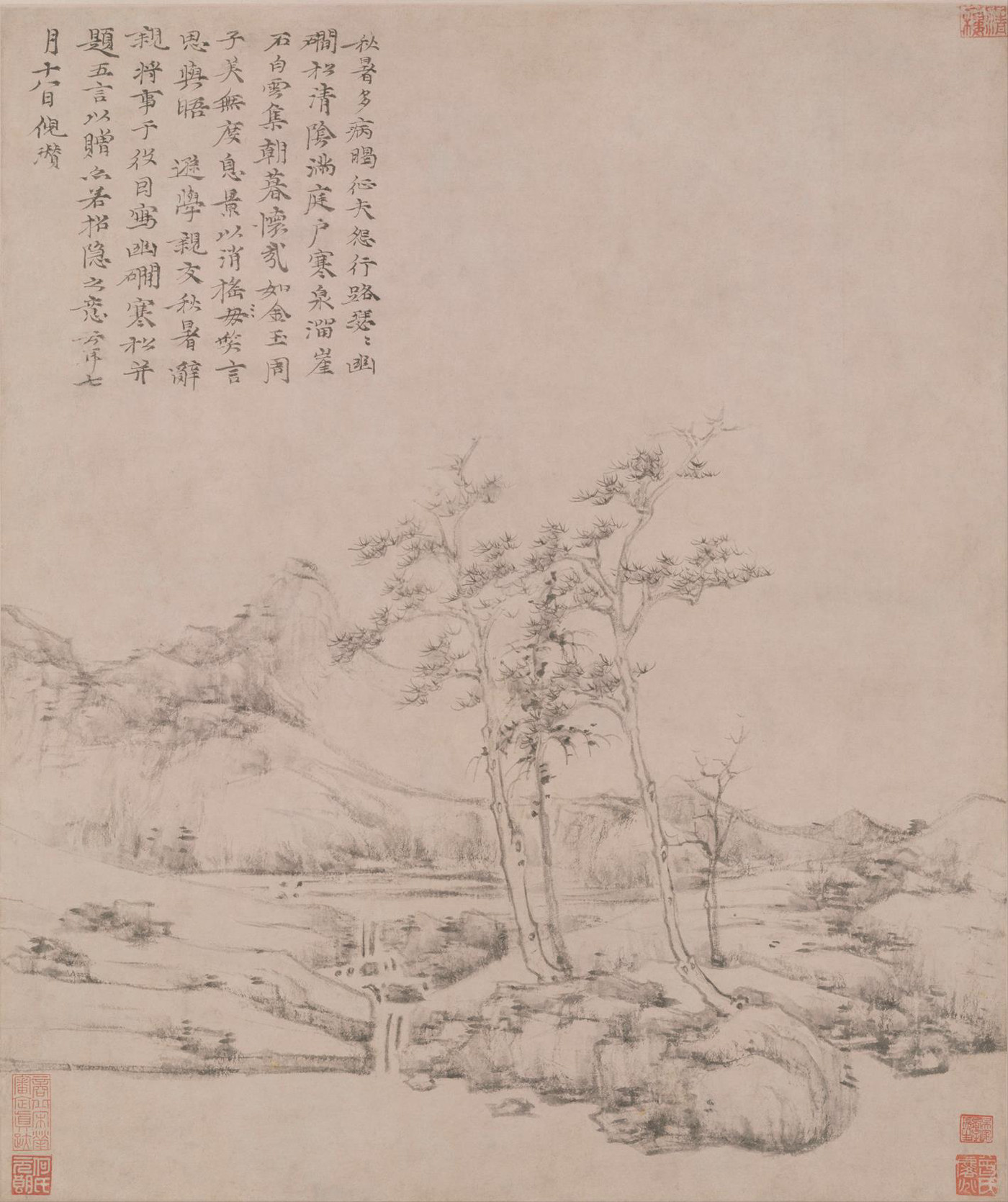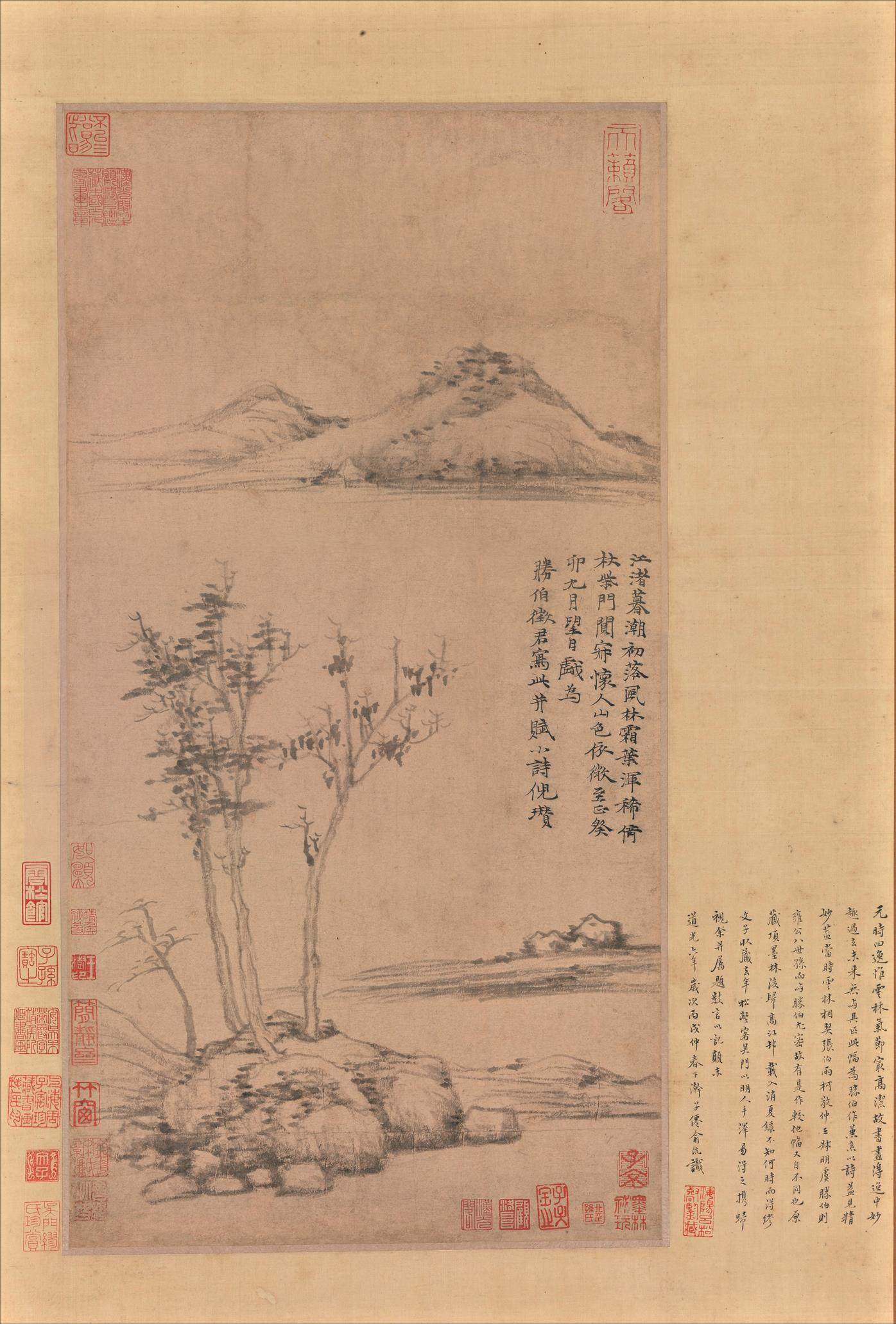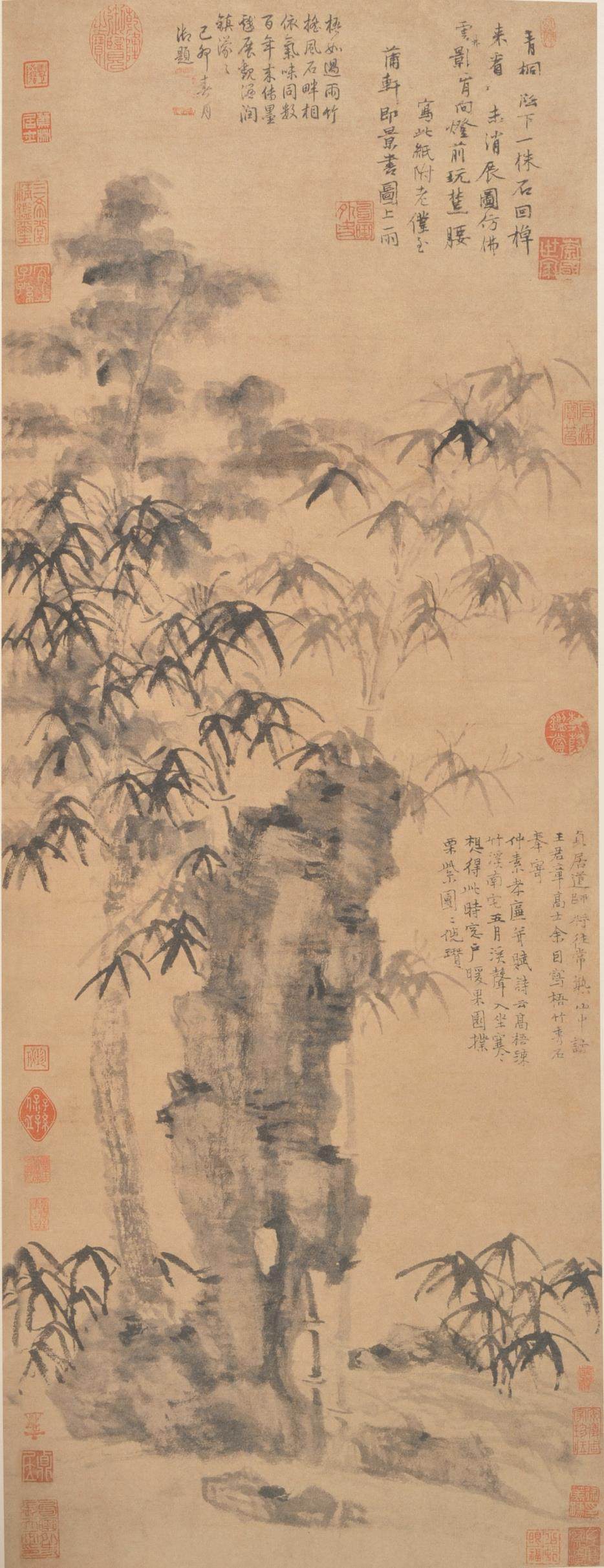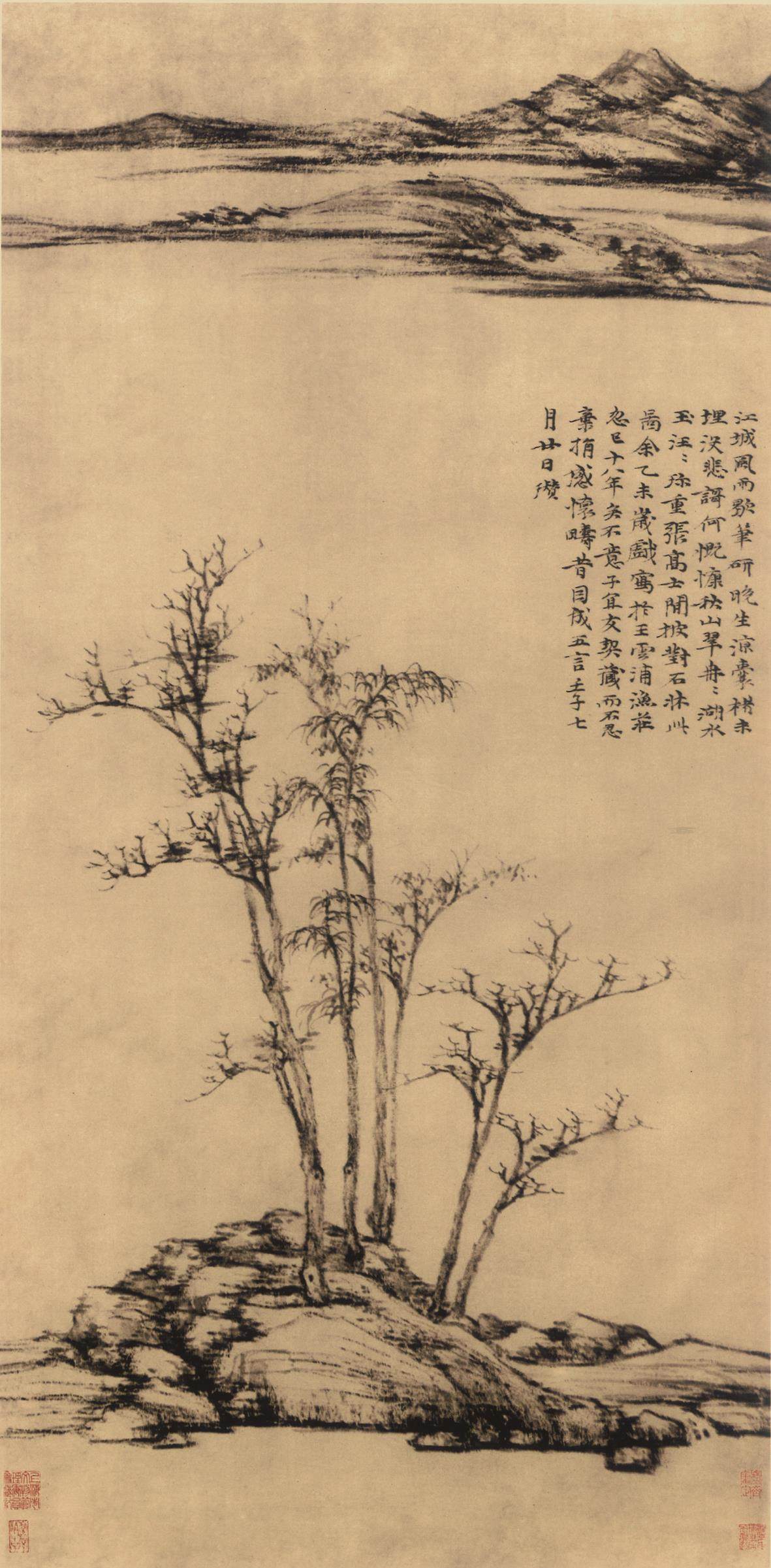 《苔痕树影图》是倪瓒去世前二年绘就的画作,画家时年72岁。该画简洁至极,仅仅描绘两株枯树、一块巨石和数丛细竹。左边枯树较为高大,右边枯树相对低矮。伟岸挺拔的枯树暗喻坚贞高洁之君子品德;画家以侧锋渴笔折带皴刻画巨石,展示山石坚凝的质感。画上竹枝颇细,似断还连,竹叶虽然稀疏,但清气撼人。全画用笔草草,墨色淡雅,意境疏寂,表现了画家独有的胸中逸气。画面左上侧写有倪瓒自题六言诗一首:“石润苔痕雨过,竹阴树影云深。闻道安素斋中,能容狂客孤吟。”末识“十一月五日余遇牧轩于吴门客邸,求赠安素斋高士并赋,壬子倪瓒。”该画右上侧另有二题,其一为沈应题七绝诗一首,其二为云泉子题五绝诗一首。从以上两题来看,除以画来赞美倪瓒的人格外,也表达了对倪瓒生平的回忆,所以这二题应该是倪瓒去世后沈应和云泉子所为。图中钤(钤印即盖印)有清初耿昭忠、耿嘉祚等鉴藏印,明代汪砢玉《珊瑚纲》等书著录,著录中名此作为“安素斋图”。
