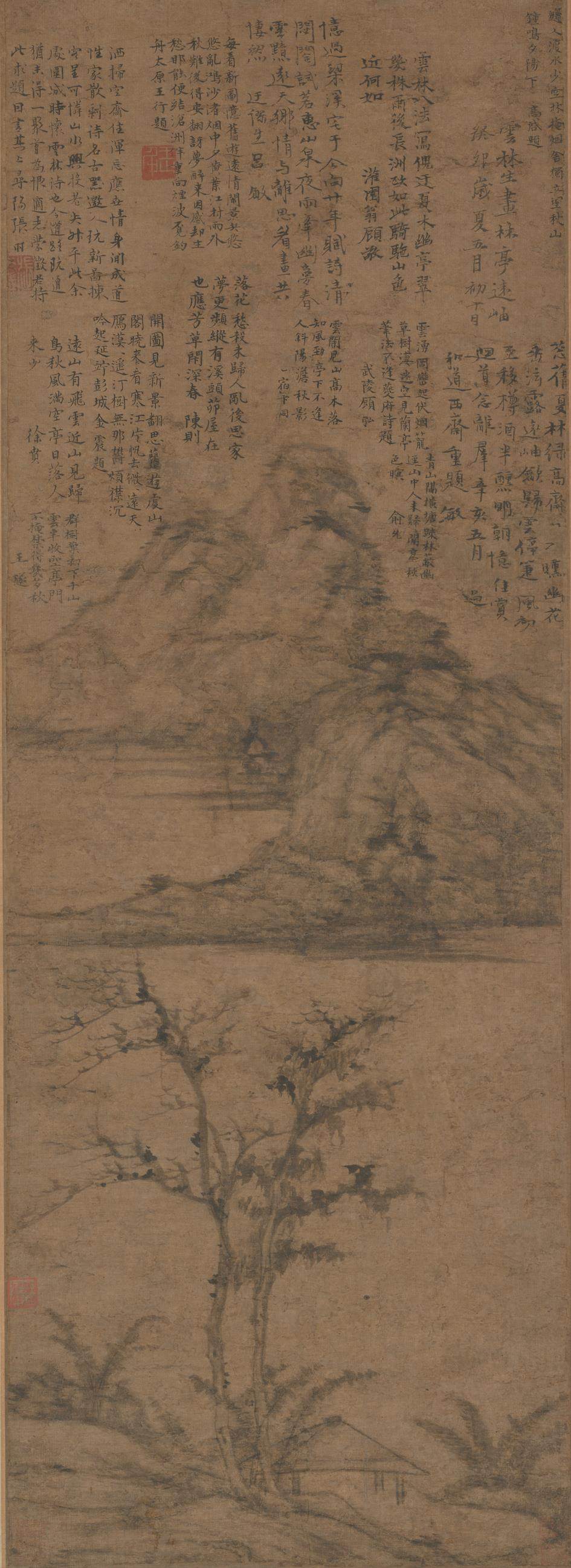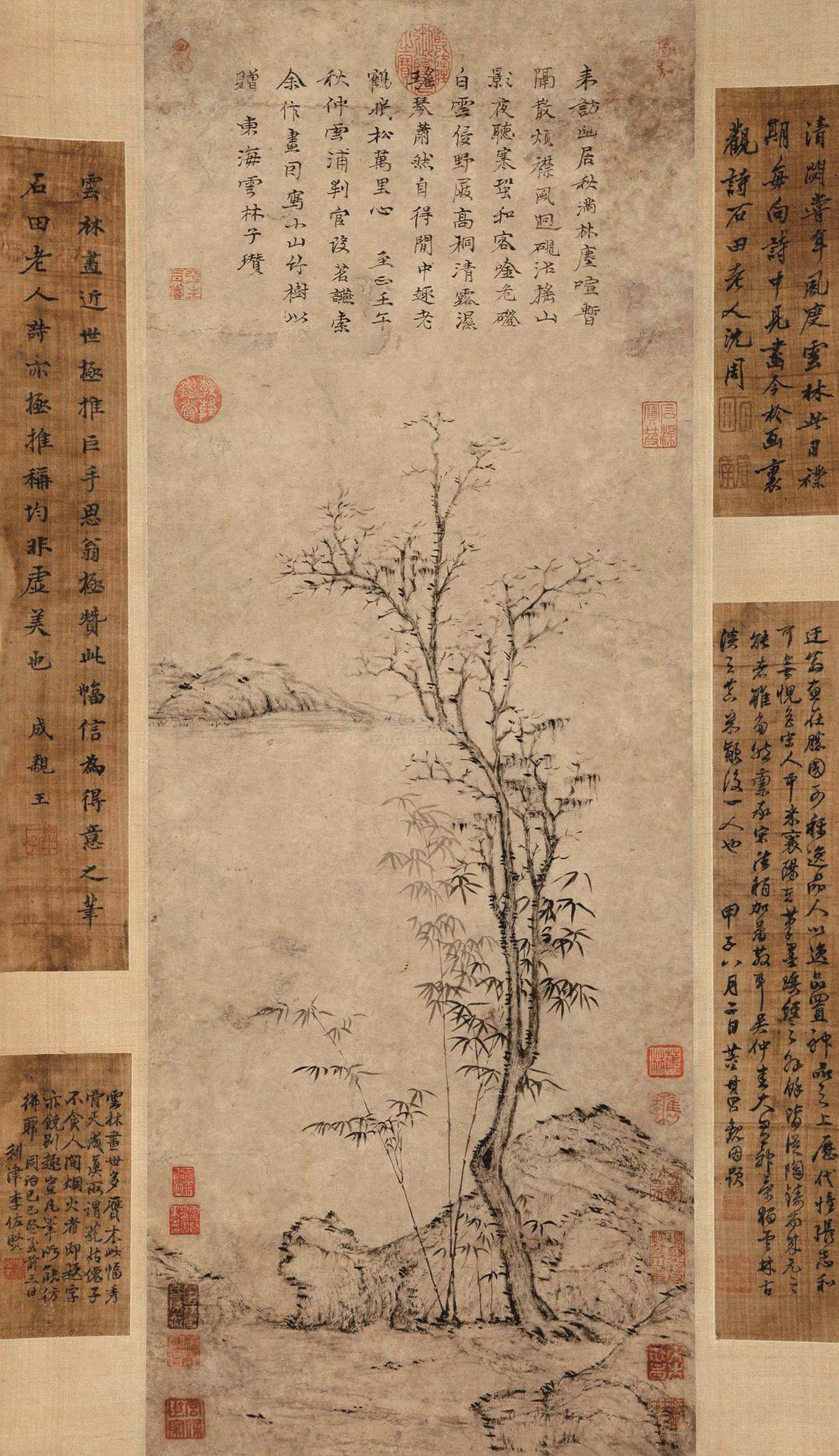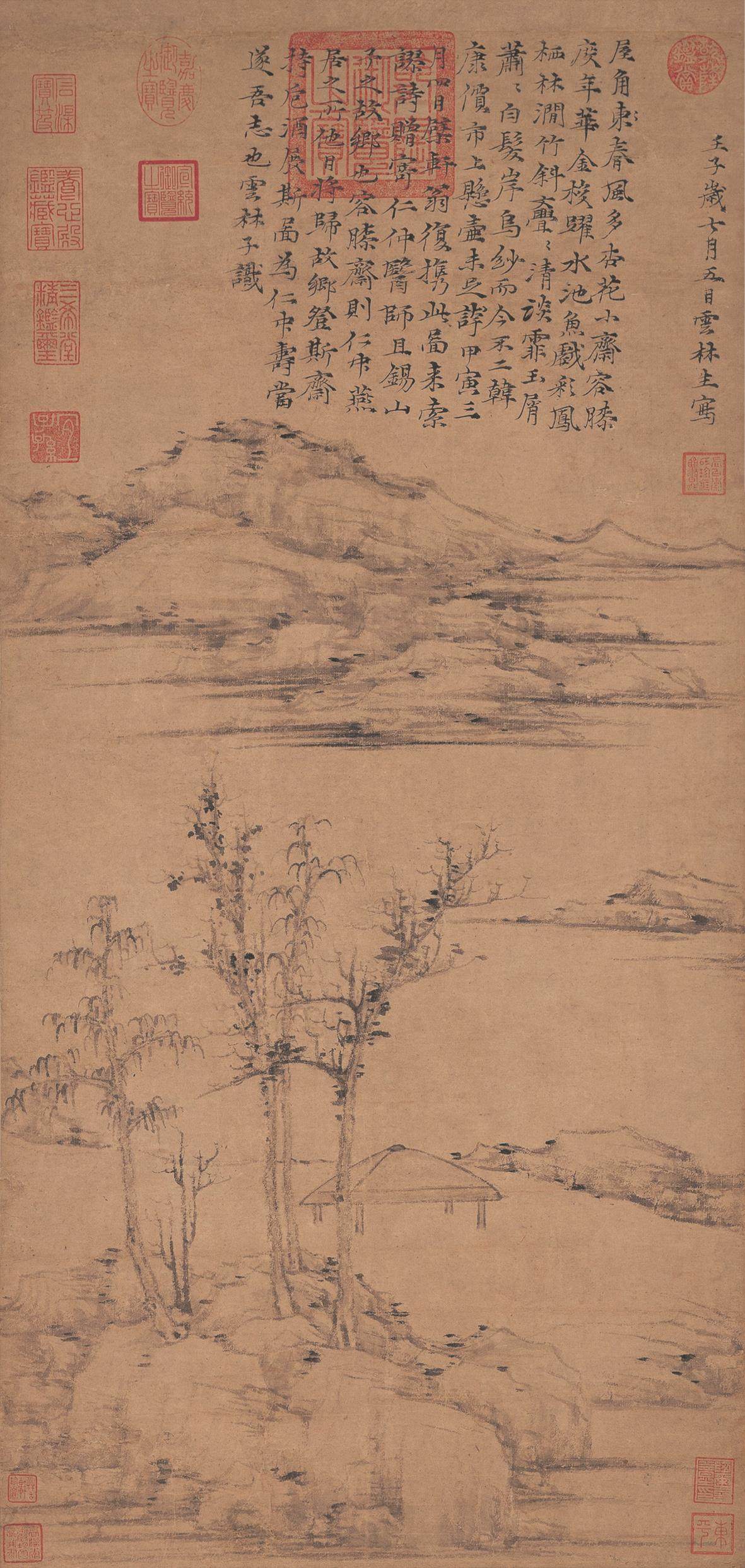 倪瓒(1301—1374),初名倪珽,字泰宇,别字元镇,号云林子、荆蛮民、幻霞子,江苏无锡人,元末明初画家、诗人、书法家。倪瓒博学好古,四方名士常至其门。他性好洁而迂僻,人称“倪迂”。其家原为本地富豪,因元末社会动荡,他于元顺帝至正初年卖掉田庐,散其家资,浪迹于五湖四海之间,寄居于村舍和寺观之中。洪武七年(1374年)倪瓒去世,时年74岁。