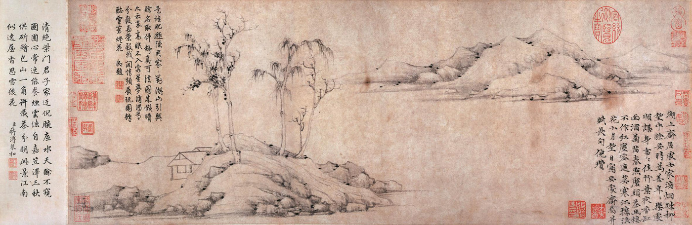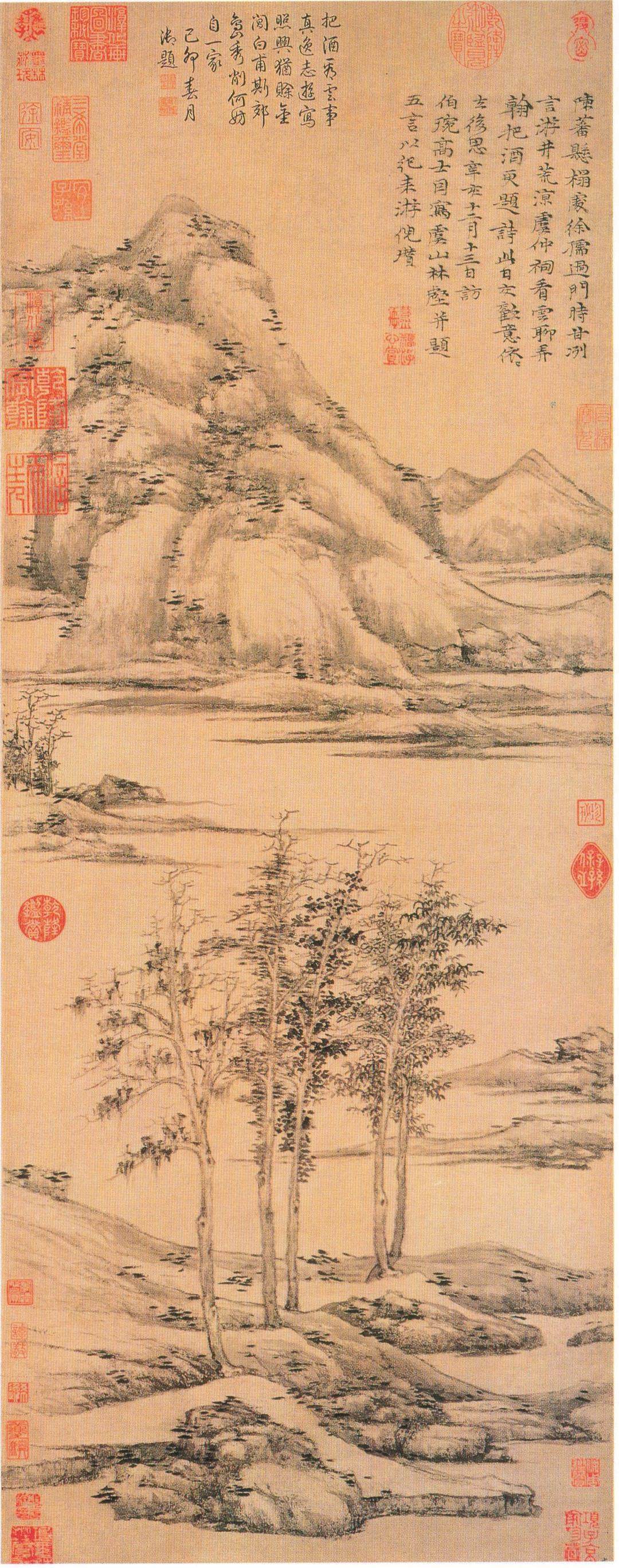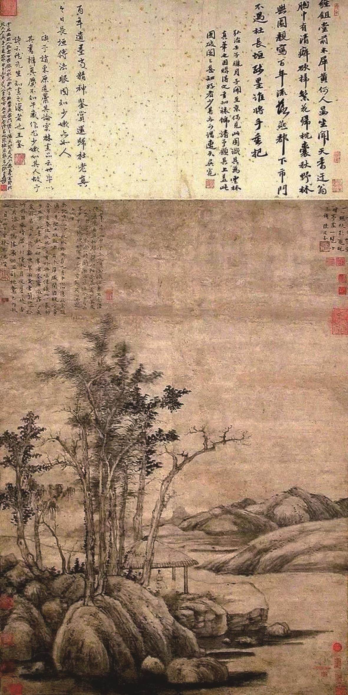 刘纲纪曾据此对元画与宋画的根本区别作了精彩的分析:“宋画力求通过对疏林枯柳的尽可能有逼真感的描绘,去传达它在人心中唤起的情感意味。这种逼真是经过艺术家创造出来的逼真。但宋画终究很重视这种逼真。而元画则认为有否宋画所重视的逼真感是无关紧要的,重要的是对疏林枯柳的描绘是否能充分表现人的内在的心境、情感意味。即使这种描绘是不同于宋画精细刻画的‘逸笔草草’的描绘,也同样是成功的艺术作品。所以,我们可以说宋画是要通过逼真感(艺术的逼真感)的描绘去传达、寄寓某种情感意味,而元画则要超越这种逼真感的追求,更直接强烈地呈现人内心的某种情感意味。”[13]