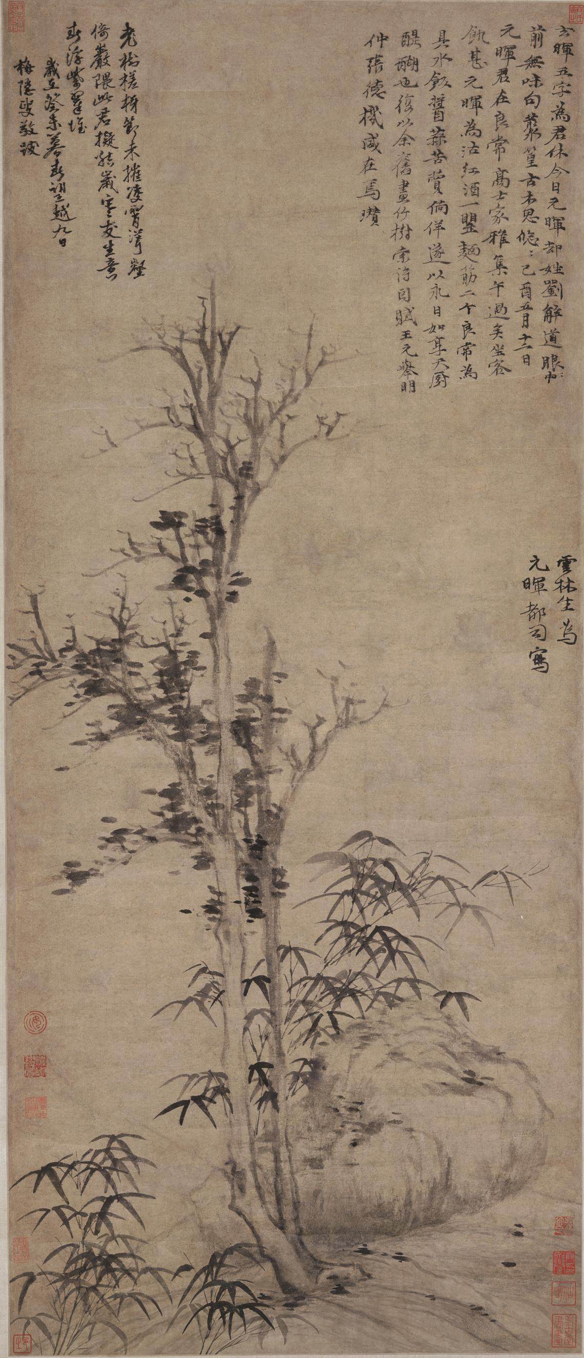 《古木幽篁图》右侧绘一平坡,之上耸立一块巨石,巨石左边立有一棵寒树(常绿而生寒的树),寒树之侧又有双竹分立左右,呈V字形挺立,竹子周边亦有数丛低矮细篁。该作品构图简括,以一石、一树、数竹形成萧朗、荒凉、寒冷之境。此画用笔简约率真,寒树以鹿角法(一种画树的方法)画出,巨石用折带皴绘就,寒树和巨石均以干笔淡墨写出,竹叶则以简率轻盈的介字点法描绘。该画右上方写有作者自题诗一首:“古木幽篁寂寞滨,斑斑藓石翠含春。自知不入时人眼,画与皎溪古遗民。”款署“云林生”。该诗左侧另有马治及吴兴松泉隐者各题诗一则,可谓书画合璧,融为一体。