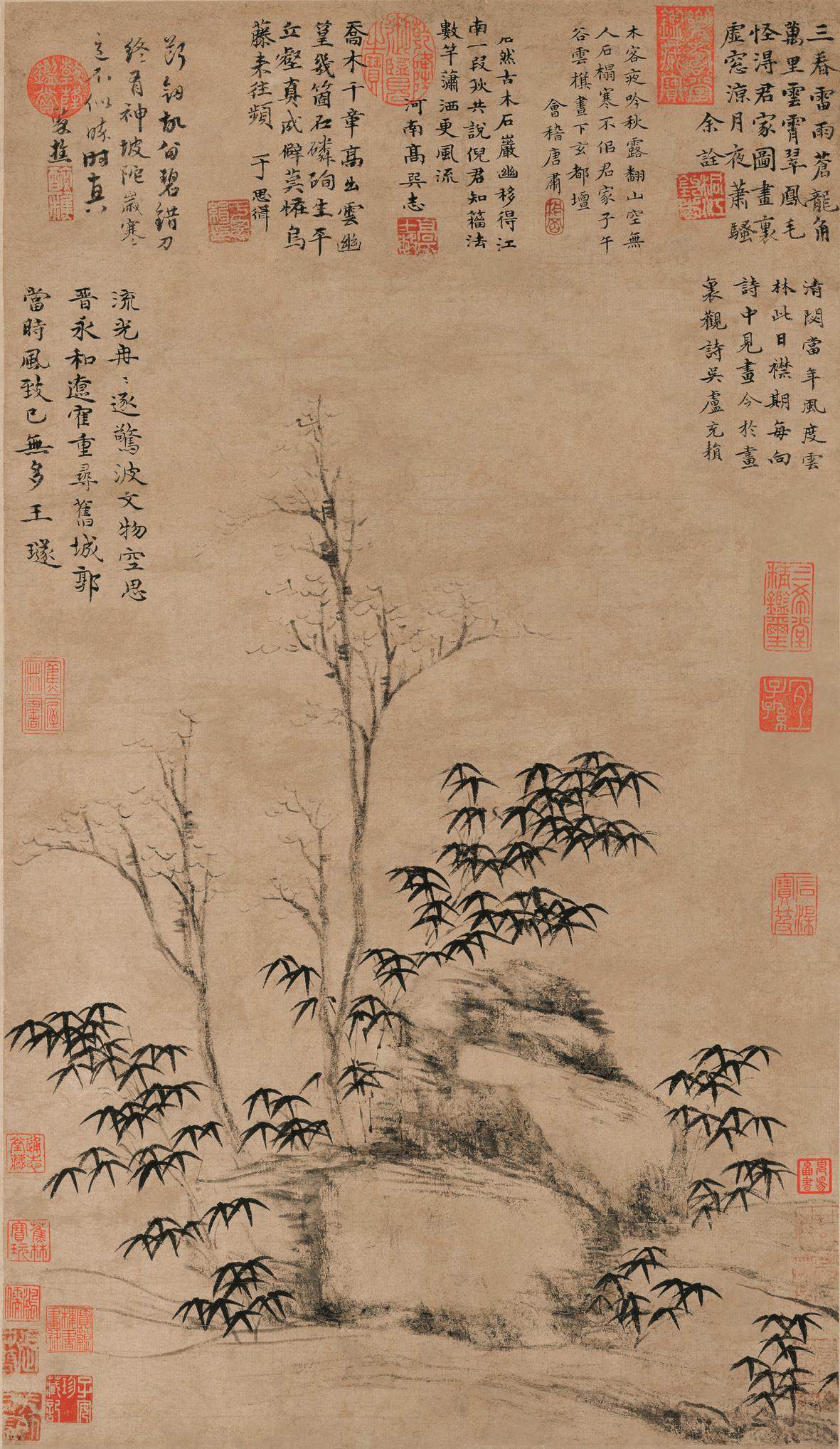 《琪树秋风图》以淡墨侧锋皴擦描绘坡上乔柯(高枝)拳石(小石头),再用浓墨刻画细竹五株,苍古之中蕴藏秀润之气。画面呈现平远的小景,零零散散,悄无声息,枝头无绿叶,仅有萧疏瘦硬的干枝,淡然、清冷、寂寞之意油然而生。