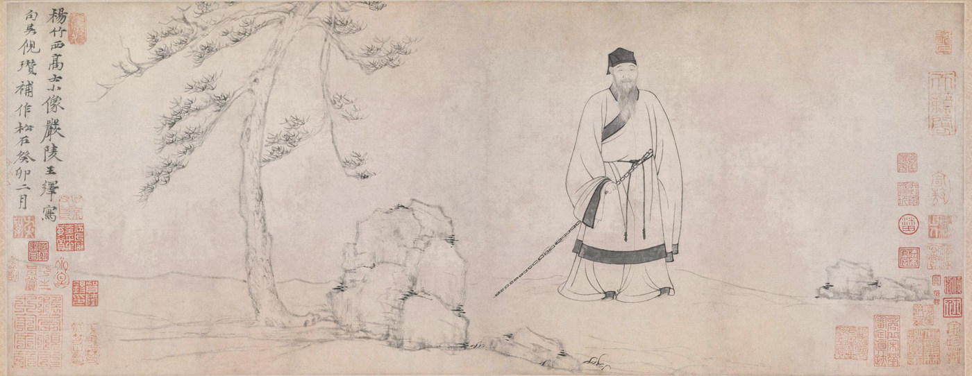 《杨竹西小像》是台北故宫博物院收藏的唯一一幅倪瓒之设色作品,也是笔者见到的唯一一幅由倪瓒和王绎合作、将人物画与山水画整合一处的纸本水墨作品。此画由王绎执笔画人物,倪瓒补景。杨竹西即杨谦,他是南宋移民,号笔西居士,华亭(今上海松江)人,其不屑于入世,隐居江南,与倪瓒、王绎交往密切。王绎是元代的一名肖像画家,主要活动于元至正年间。此画描绘的是杨竹西晚年隐居时的形象。画作以人物为主体,以古松、堆石为背景,主要采用白描的手法创作而成。