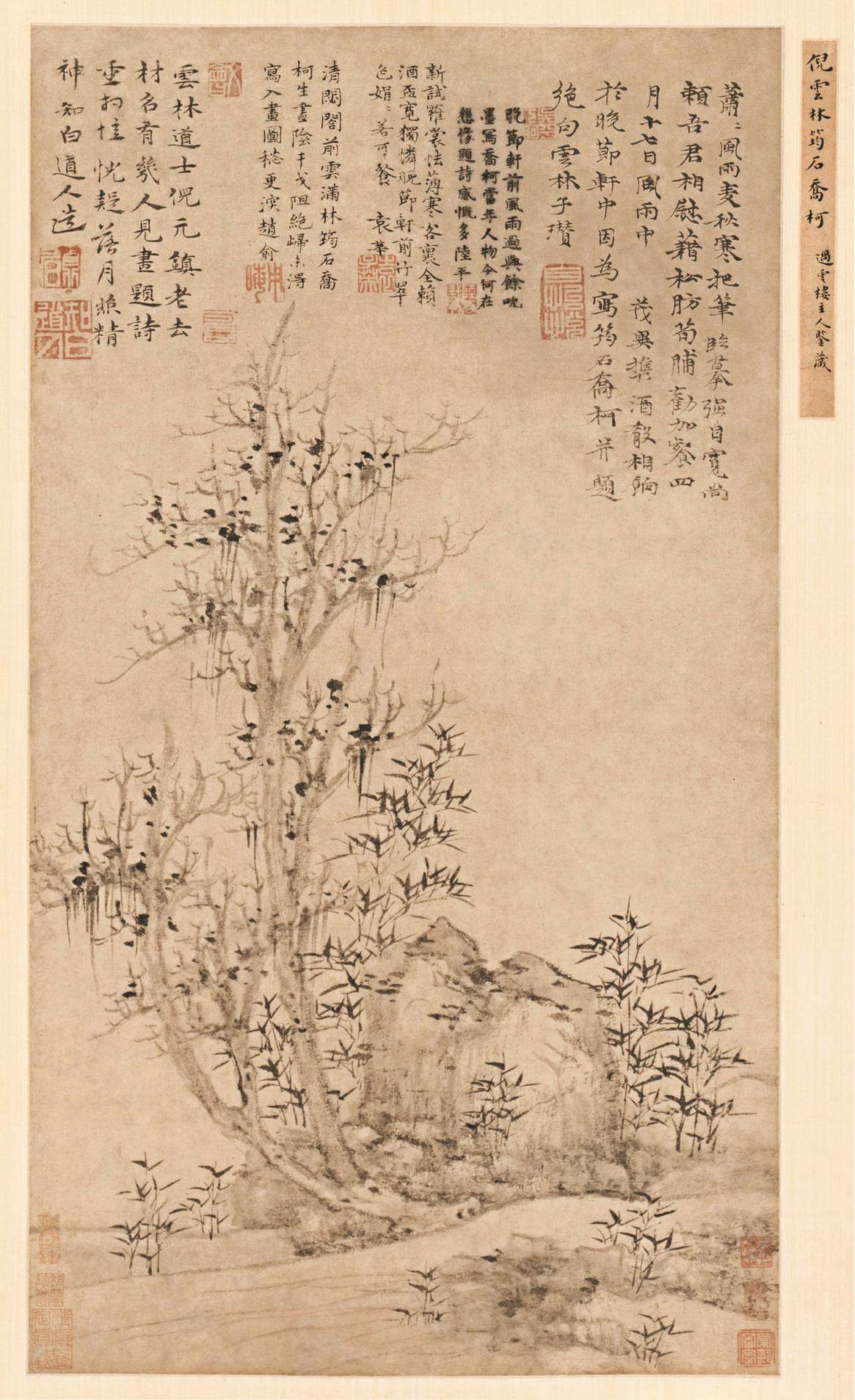 《筠石乔柯图》左侧描画一棵古树,右侧绘一块圆石,另有数丛幽篁散落于树石周边。画家以粗笔水墨勾勒巨块轮廓,以细皴刻绘石块阳面;倪瓒用淡墨绘就古树,鹿角式枝杈微微上仰;以浓墨写出数丛细竹,幽篁杆直叶茂,勃勃生机。总之,该画疏林秀美,大石苍朴,竹子以双钩笔法绘出,老树和巨石用淡墨描画,一种幽静萧简的审美意境油然而生。画面右上侧有倪瓒亲写题跋释文:“萧萧风雨麦秋寒,把笔临摹强自宽。尚赖吾君相慰藉,松肪笋脯劝加餐。四月十七日风雨中,茂异携酒肴相饷于晚节轩中,因为写筠石乔柯并题绝句。云林子瓒。”下钤白文长方印“自怡悦”。画上方还有陆平、袁华、赵俞、知白道人四家题诗及梁清标等人鉴藏印三方。此图著录于张丑《真迹日录》、顾麟士《过云楼书画续记》及容庚《倪瓒画真伪存佚考》等书中,画上七绝诗见《清閟阁集》卷八。题跋中第三句“尚赖吾君相慰藉”,诗集中均为“尚赖俞君相慰藉”。虽然《清閟阁集》并非倪瓒生前自印本,而是后人编撰,但所有《清閟阁集》中的文字与《筠石乔柯图》上的题跋文字都有异处,在已知的古本《清閟阁集》中,诗题均为《筠石乔松》,“松”与“柯”非通假字,所以此画与《清閟阁集》的记载有出入,因此不能不令人生疑与谨慎对待。