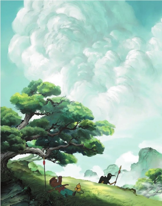 在《中国奇谭》的8个短片中,充斥着东方元素的美学画面。在《小妖怪的夏天》中,大量采用山水画为背景,比如在短片的一开始,在小猪妖跟乌鸦精对话的镜头中,我们能看到巍峨的高山,缥缈的白雾,苍劲有力的青松,以及山水画中独有的怪石,整个构图很有艺术感。