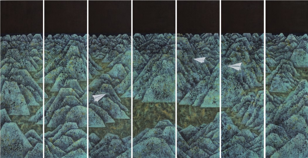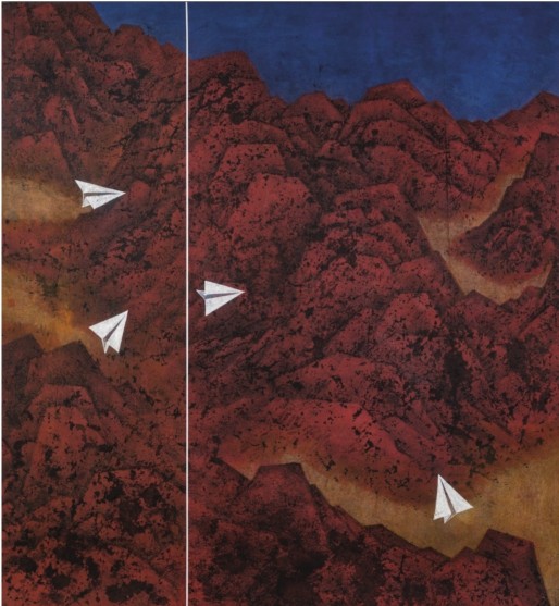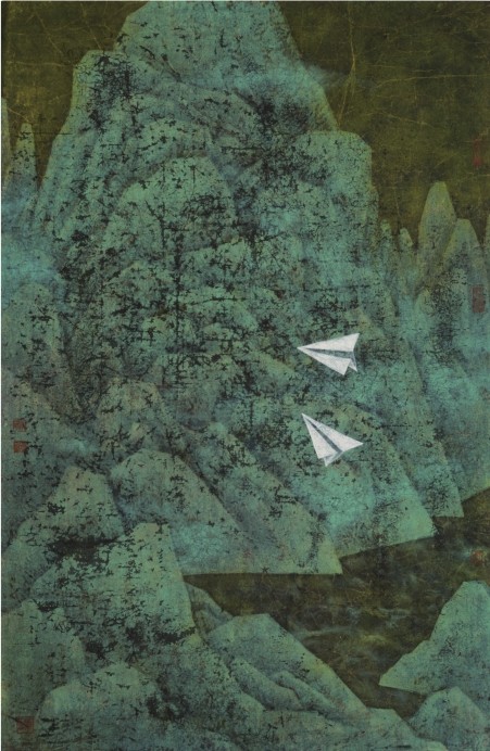 《云梦系列——醉乡村》以青绿山水为主体,辅之以浅绛的背景色,所绘山脉可谓“密不透风”,几湾河水环绕其间,可谓疏密得当;三只纸飞机分两组于上空飞翔,它们与山脉、河水形成动静对比。幽静的山村、旖旎的风光勾起艺术家儿时的回忆,作者流连忘返,陶醉其中,这是他对家乡的深深眷恋和不尽的思念使然。