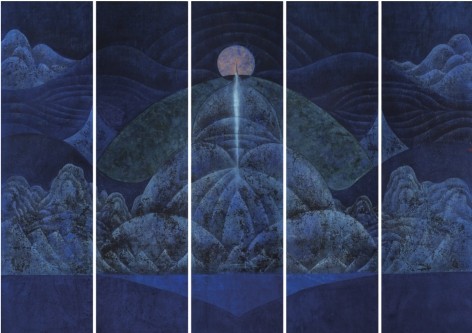 《大自在系列——川映月》是一幅五联画,它将唐卡中的某些佛教元素(如莲花)与中国山水画的图像进行巧妙结合,中间一轮圆月映照于山川之上,作者在此大量使用新积墨法和新积色法,尤其是将光引入传统山水画中,这是中西两种美学追求与两种艺术技法的融合。画家笔下的山川,已经脱离了具象的描绘,而走向了几何抽象与形式概括。作者大量使用蓝色,蓝色调是一种冷色调,既是永恒的象征,也代表宽容和爱,寓意宁静、深邃、遥远、童真、明亮、干净、通透之境。蓝色调越深,越能把观者带到无穷无尽之处,这种梦幻的色彩让人感受到清澈、浪漫、稳重、美丽、理智、安详的美感。